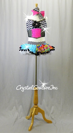 Black and White chevron lycra crop top with Black mesh and Pink sequined lycra, accented with a Black flower. Black and White checkered lycra trunks with Multi-Color/Blue and White polka dot skirt skirt, with White voluminous mesh underneath. Costume is enhanced with rhinestones!! *Accessories include: two large Pink, Black, and White hairbows and two Pink mesh spats with Black bows