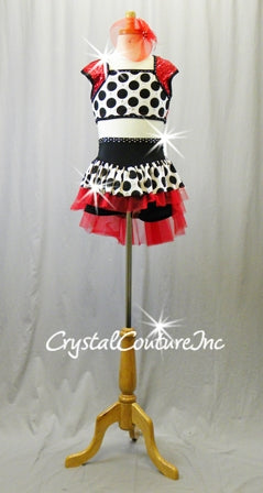 Sassy Black/White polka dot lycra top and skirt with Red accents. Top has Red zsa zsa sequin back and sleeves, trimmed with Black lycra. Paired with polka dot skirt, Red tulle layer and attached Black booty shorts. Costume is decorated with rhinestones!!