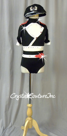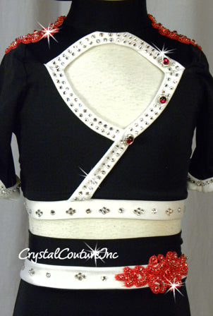 * Darling Black and White custom made short sleeved crop top and briefs are made of Black lycra, White lycra and accents of Red lycra (back straps). Embellishments include Red rhinestone/beaded/sequin appliques at the shoulders and hip, rhinestone buttons and Swarovski rhinestones! Great costume!
