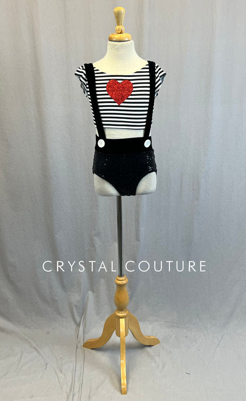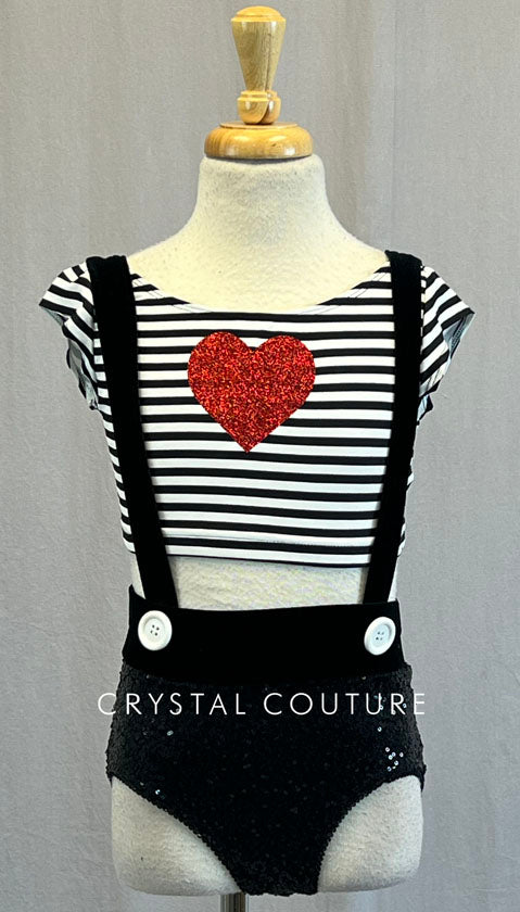 Black and White striped short sleeve crop top has scoop neckline and glittery Red heart on front of chest. Black zsa zsa trunks have velvet waistband and attached suspenders. Large White button on each suspender where it meets front of waisband.