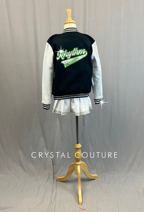 Black "Rhythm University" varsity jacket with White sleeves and striped cuffs and neck. Snap closures on front. Paired with Black zsa zsa bra top and White pleated skirt. 13 Gross of Crystal 20ss, Jet 9ss and 20ss, and Peridot 9ss Rhinestones!