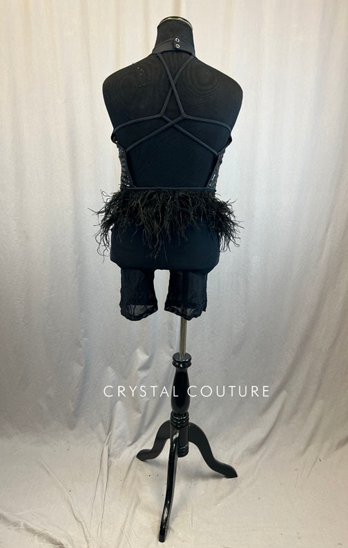 Black zsa zsa biketard with high neck, strappy cutout on bodice, mesh bike shorts over black brief, and black feather bustle. Accessories include 2 black rhinestoned clips.