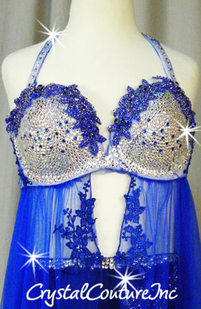 Bright Blue 2 piece bra-top with fly away sheer skirt and Blue lycra trunks. White bra-top is covered with Blue sheer mesh and is decorated with Sapphire rhinestones/beaded appliques, embroidered appliques and lots of Swarovski rhinestones! Trunks also have rhinestones applique and Swarovski rhinestones. Stunning!!