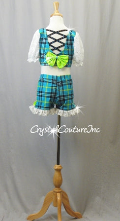 Adorable custom made Blue and Green plaid top and booty short with White lace sleeves and ruffles. Costume is accented with ruffles, Black straps and Lime Green bows. Decorated with Costume is decorated Swarovski Rhinestones!!