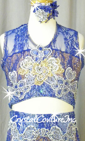 UNBELIEVABLE Blue and Lt Blue floral lace custom made connected 2 piece. Base of the costume is Nude lycra covered with Sapphire Blue floral lace with insets of Lt Blue lycra. Costume is decorated with Lt Blue embroidered flower lace appliques with a touch of Gold "leafs". Swarovski rhinestones decorate the entire costume enhancing the detail. Simply amazing!!