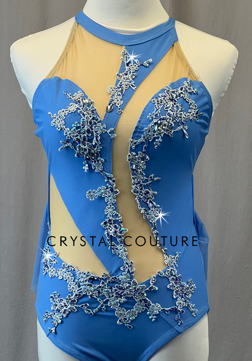 Sky Blue leotard with high neck and Nude mesh cutouts. Floral lace appliques along edging of cutouts and filled with rhinestones. Blue mesh "wings" attached at upper back and drape down to hip level.