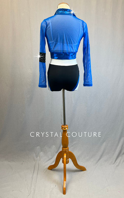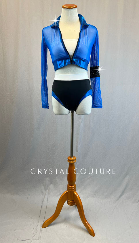 Blue mesh long sleeve crop has full zip front and metallic collar. Wide Black band around left elbow. High waisted trunks are Black with White waistband and Metallic Blue inserts around legs. White camisole bra top paired underneath. 2 Gross of Bermuda 30ss, Sapphire 20ss and 30ss, and Jet Hematite 20ss Rhinestones! Custom made by The Line Up!