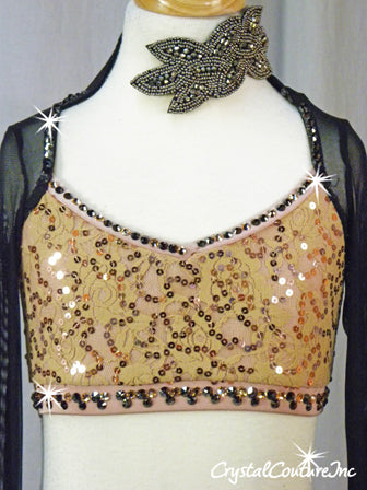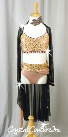 Nude, Blush and Black custom made 2 piece top and trunk/skirt. Base of the costume is Blush lycra top and trunk with Nude sequined floral lace and highlighted with Swarovski rhinestones. Black sheer mesh attached long sleeve shrug and half skirt add dimension, both decorated with rhinestones! Additional soft Blush sheer mesh drapes around the back of the skirt. Very pretty!