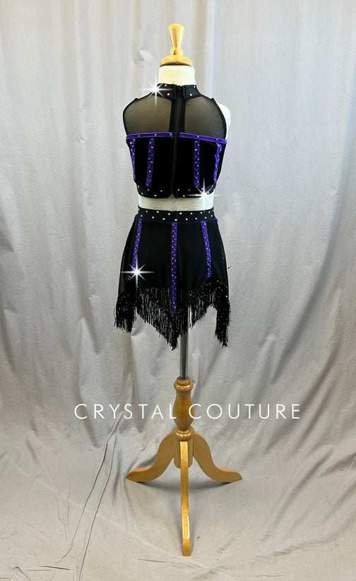 *Brand New* Custom Full Two-Piece Black and Purple Fringe Set - Rhinestones
