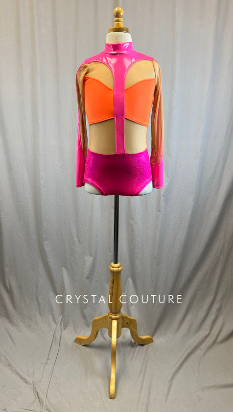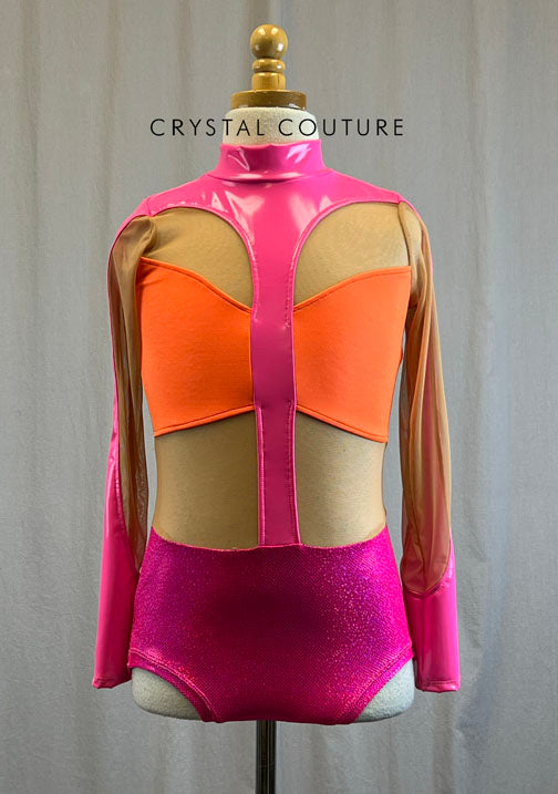 *Brand New* Hot Pink and Orange Pleather and Metallic Leotard with Mesh Inserts