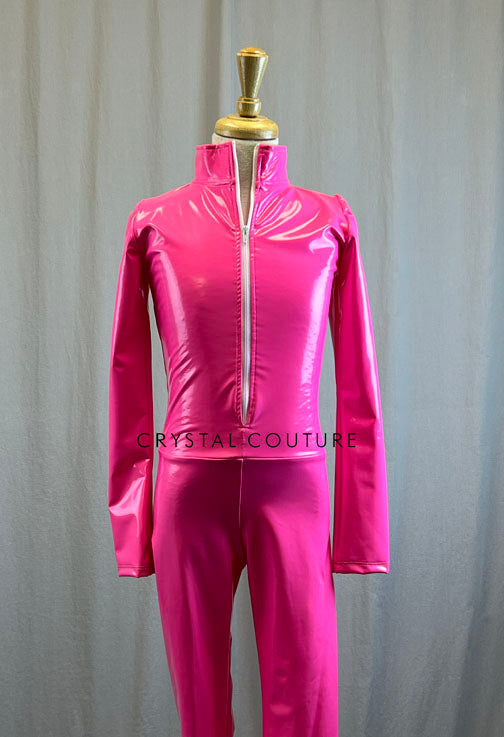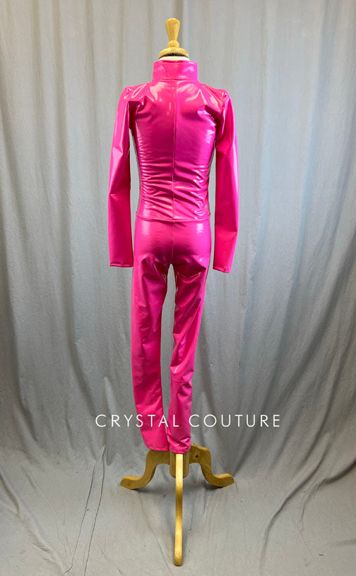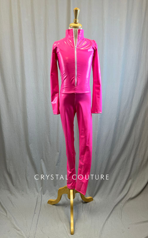 New never worn. Hot pink latex unitard with long sleeves, high neck and legging bottoms. Detailed with working white OR pink zipper (we have one of each). Custom made by The Line Up!