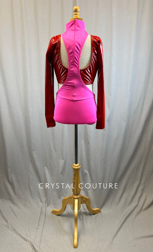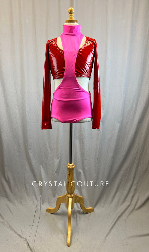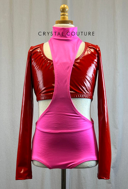 New, never worn. Red pleather long sleeve bra top is paired with a hot pink lycra cut out leotard with high neck and zipper up the back. These two pieces are separate. Custom made by The Line Up!