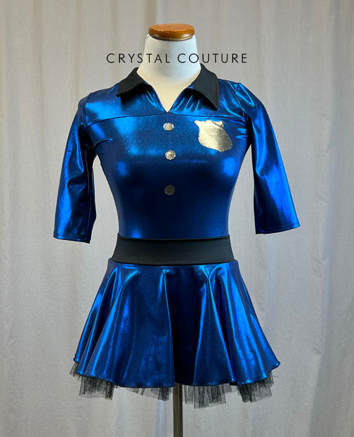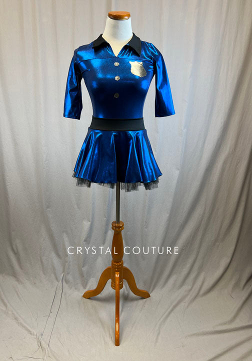 New, never worn. Royal blue metallic Police inspired dress with shield, 'Police' on back, and buttons. Dress also has a black collar, quarter sleeves, and tulle layer on skirt. Custom made by The Line Up!