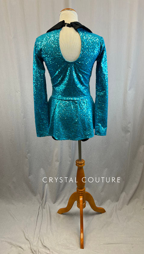 New, never worn. Turquoise zsa zsa suit-like leotard with black attached brief, black collar, and black bow tie. Accented with two silver buttons. Custom made by The Line Up!