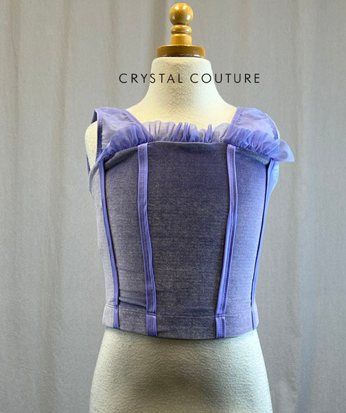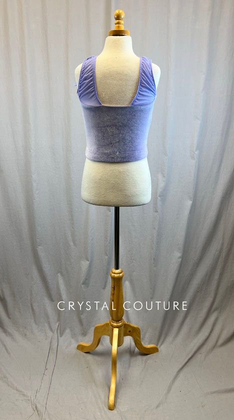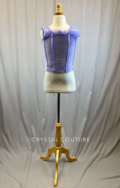 New, never worn. Violet purple velvet corset top with mesh straps. Violet mesh fringe across top of chest for coverage.