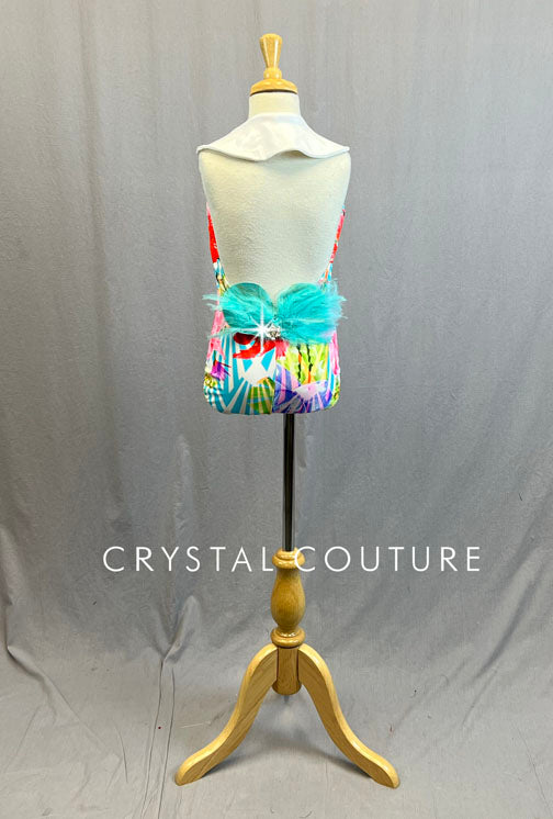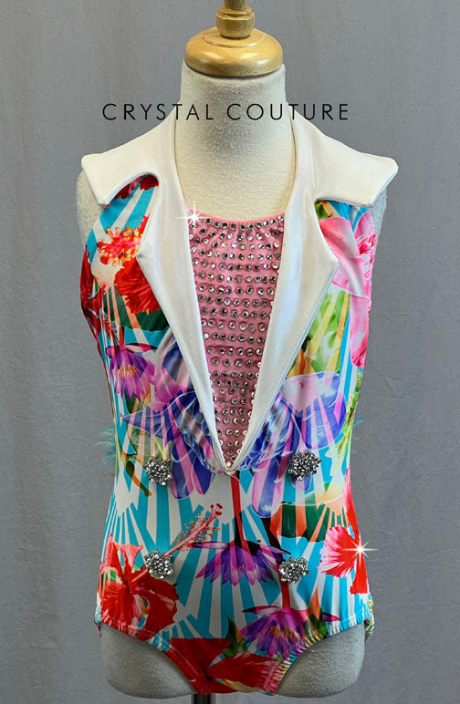 Bright Floral Print Leotard with White Collar and Aqua Feathers - Rhinestones