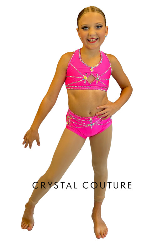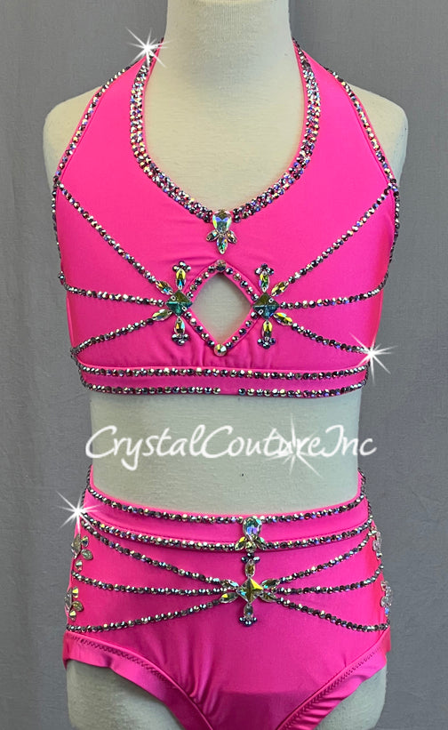 Custom Bright Pink Halter Two Piece with Strappy Back - Rhinestones