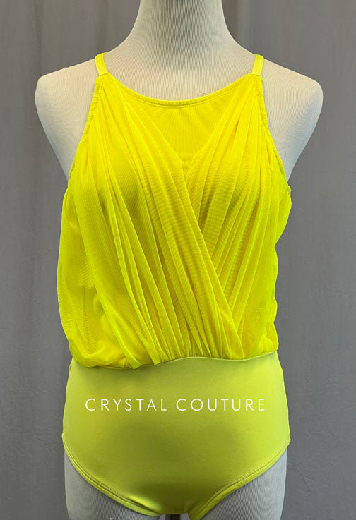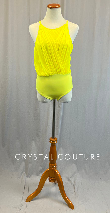 Bright Yellow lycra leotard has criss cross straps in back. Front of leotard has two gathered pieces of mesh crossing over bodice and connecting at waistline.