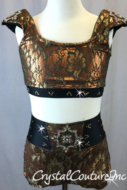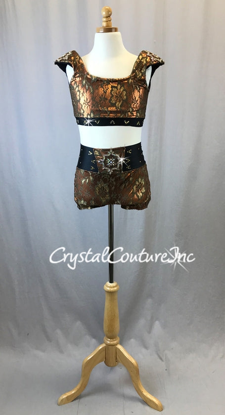 Bronze and Brown Lace 2pc Top & Short with Appliques - Swarovski Rhinestones