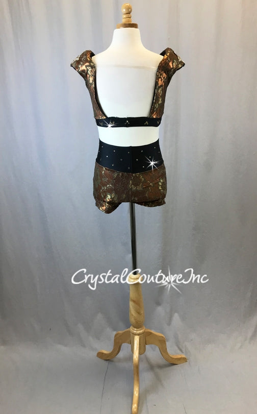 Bronze shimmery lycra top and short with Brown/Gold lace overlay and Black trim. Top has padded shoulder. Custom made costume is embellished with Bronze beaded Crystal AB appliques and Swarovski Rhinestones!