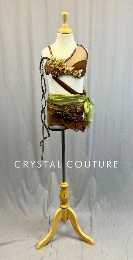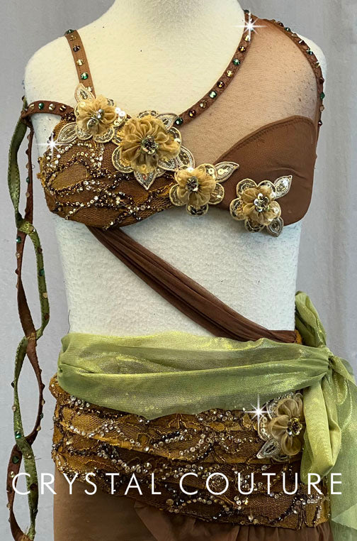 Custom made Brown sheer mesh and floral lace bra-top and booty shorts. Green shimmer mesh accents the waistband and creates the sleeve/armband criss-cross detail. Swarovski rhinestone accent the lace details with Nude/Gold flower appliques accent both pieces. Brown motionwear booty shorts are attached.