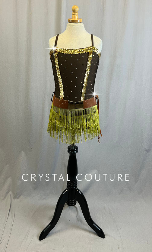 Brown spaghetti strap biketard has Gold sequin trim around neckline and two vertical strips down front sides of torso. Three layer yellow fringe skirt and Light Brown braided tassel attached. *Accessories Include: Light Brown wide belt with Gold buckle and two arm bands with finger loops and Yellow fringe.