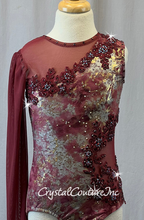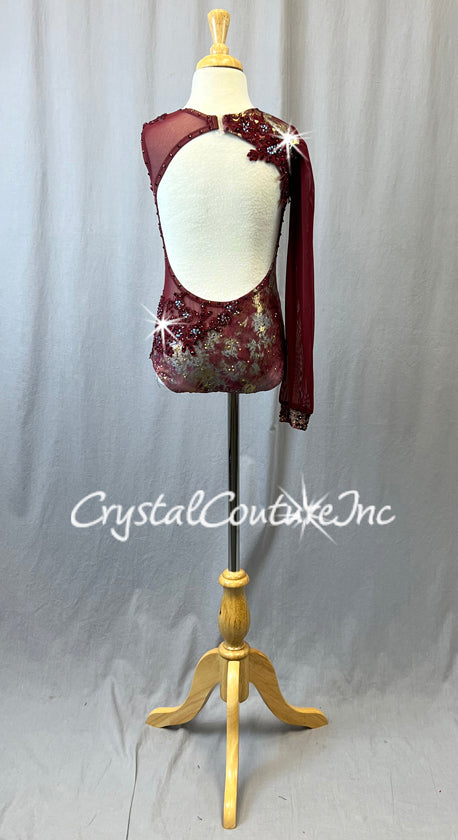 Custom Burgundy One Arm Leotard with Grey & Metallic Gold Pattern - Appliques & Rhinestones