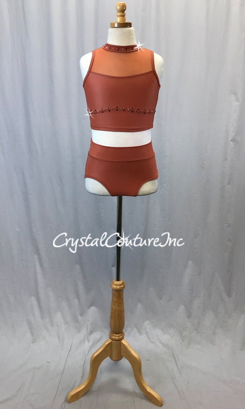 Copper lycra 2 piece crop top and trunk. Costume has Copper sheer mesh neckline and back panel insets with zipper. Decorated with rhinestones!