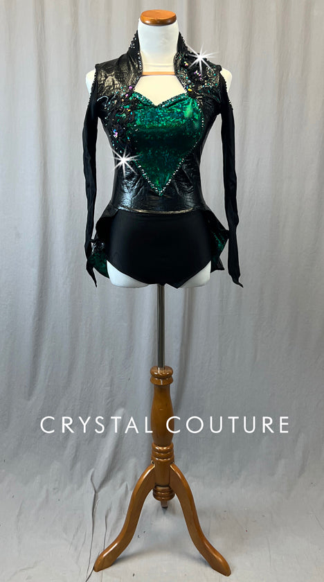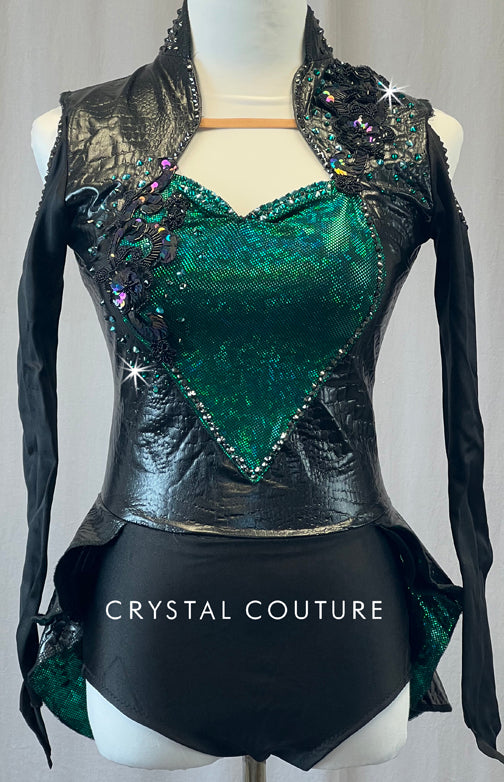 Black snake print pleather leotard has swan neck collar with a zip closure in back. Holographic Emerald Green lycra forms heart shape on front of bodice. Long lycra sleeves have open shoulders and come to a point at the end. Two tiered back skirt attached and lined with Green lycra on underside. Black appliques on shoulders and chest. *Accessories Include: Black and Green applique hair piece.