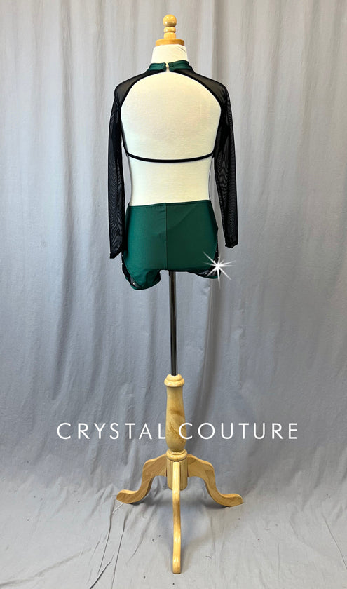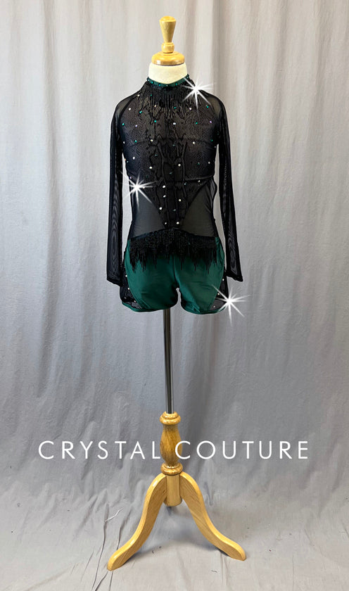 Mock neck biketard is made from Black snake skin lycra with attached Hunter Green booty shorts. Costume has long mesh sleeves, side mesh cutouts, and mesh on outsides of shorts. Open back with single thin horizontal strap. Beaded fringe at neckline and at front waistband of shorts.