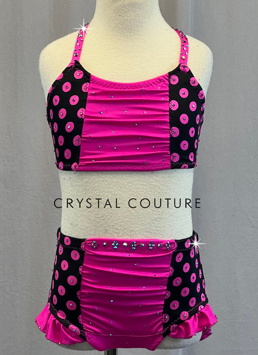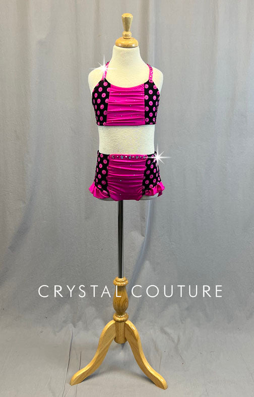 Custom Black & Pink Polka Dot Two Piece Ruched Panels - Rhinestones