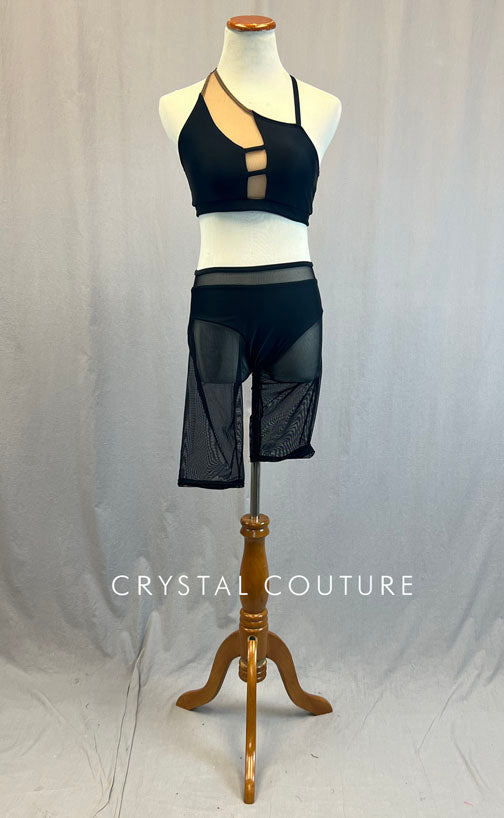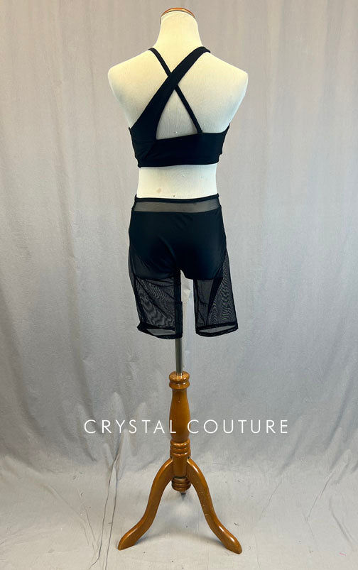 Custom Black Asymmetrical Two Piece with Mesh Shorts - Rhinestones
