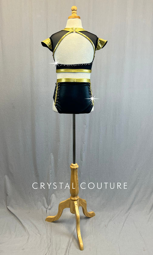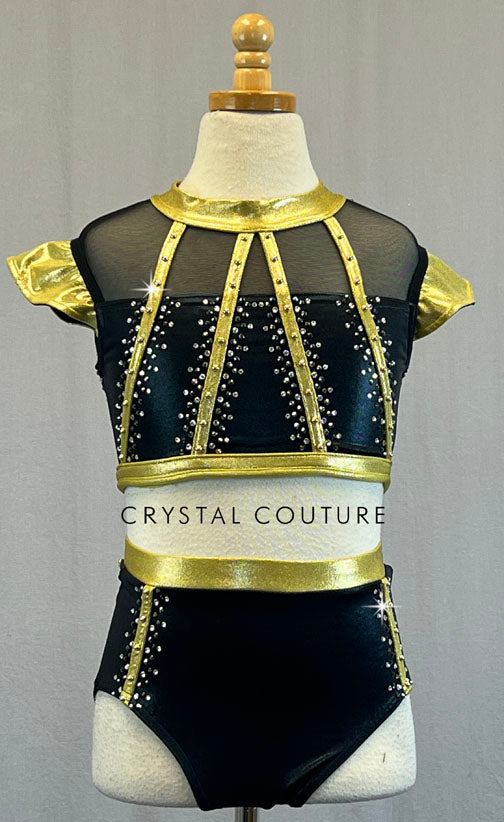 Custom Black Metallic cropped top has mesh shoulders. Gold Metallic neckline and ribcage with strapping details on front of chest. Short ruffle cap sleeves. Trunks are Black with Gold waistband and strap details.