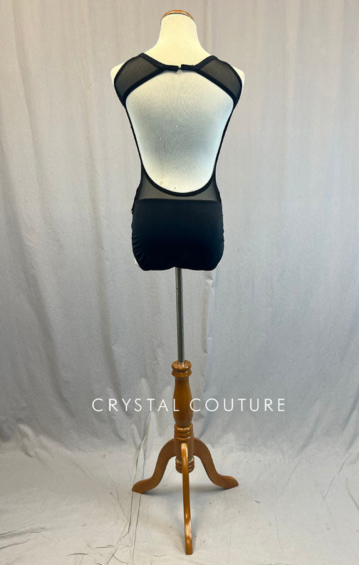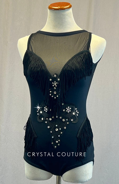 Custom Black Leotard with Mesh Inserts and Fringe - Rhinestones