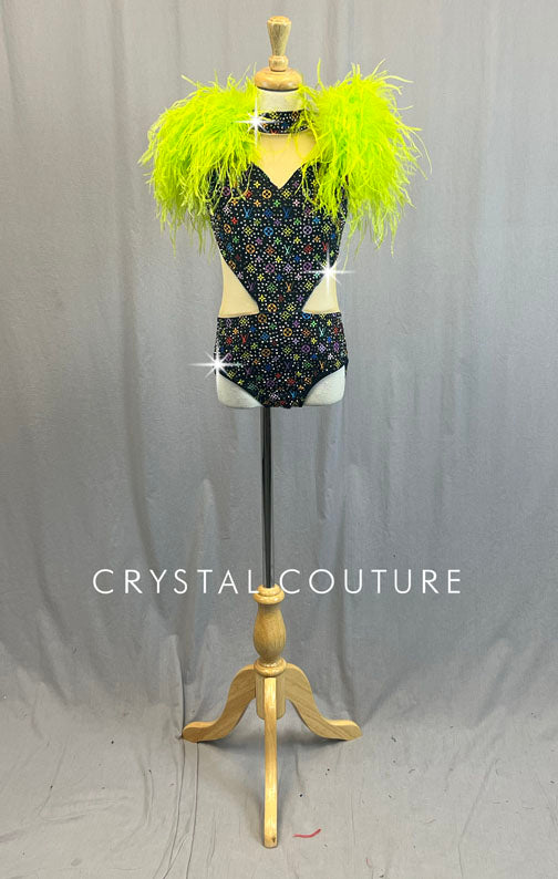 Custom Sleeveless high neck leotard has sweetheart neckline and side cutouts. Upper chest, back, and sides have Nude mesh. Fabric is Black with Multicolor Louis Vuitton logos. Lots of Lime Green ostrich feathers on shoulders. 8 Gross of Jet Hematite 12ss Rhinestones!
