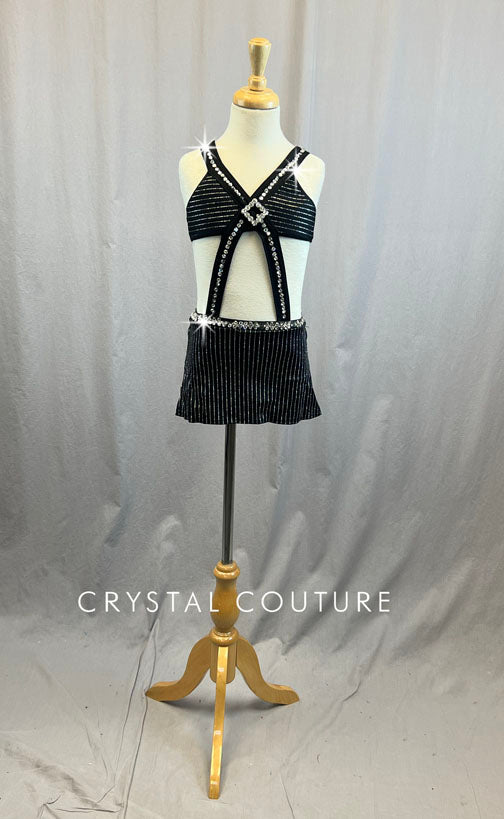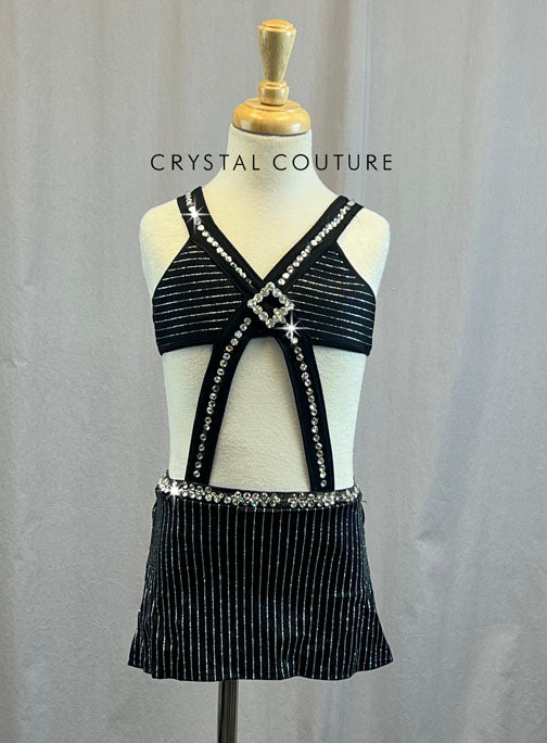 Custom black two piece with silver pinstripe accents. V neck bra top connected by two straps to mini skirt with connected brief. Accented with 2 gross of Crystal rhinestones and Crystal Brooch.