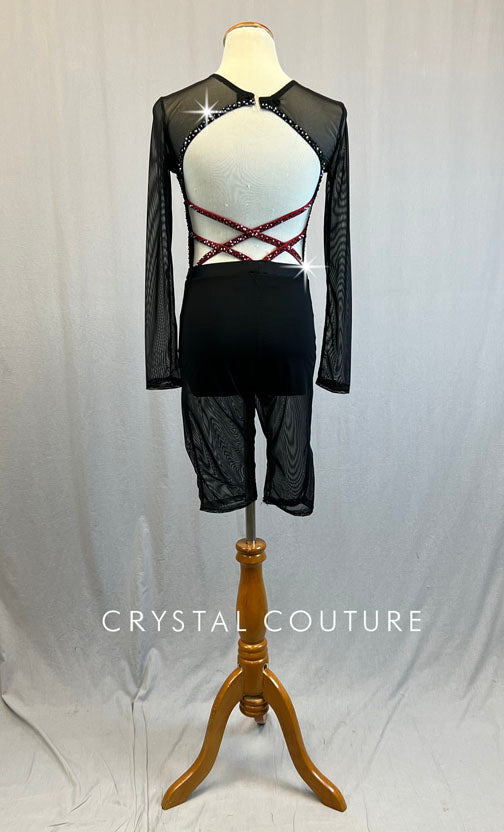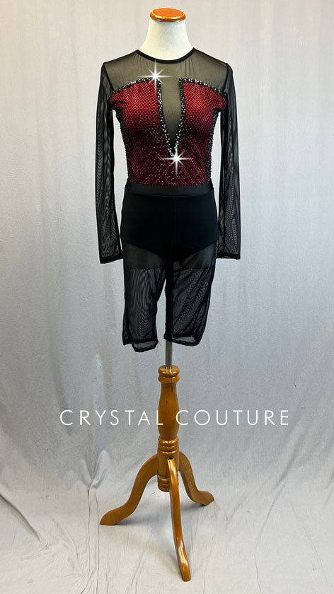Custom Black & Red Fishnet Topped Biketard with Mesh Shorts and Sleeves - Rhinestones