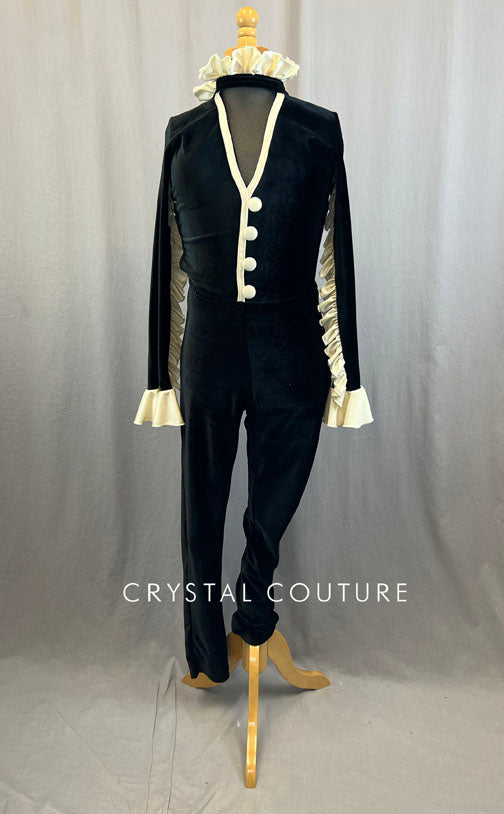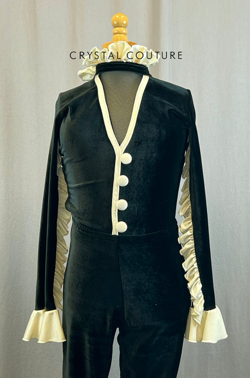 Custom Black velvet backless fitted bodysuit with Ivory lycra ruffles, trim and buttons. Top of bodice features a Black mesh V neckline under ruffle collar.