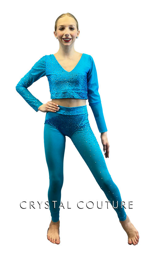 Custom Bright Blue lycra costume has V neckline with scoop in back and long mesh sleeves. Rhinestones across front of chest and on right sleeve. Matching lycra trunks are high waisted with rhinestones across front of pelvis. Long mesh leggings are rhinestoned on left leg and can be worn under or over trunks.