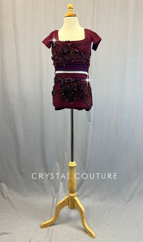 Custom Burgundy & Plum Two Piece with Floral Appliques - Rhinestones