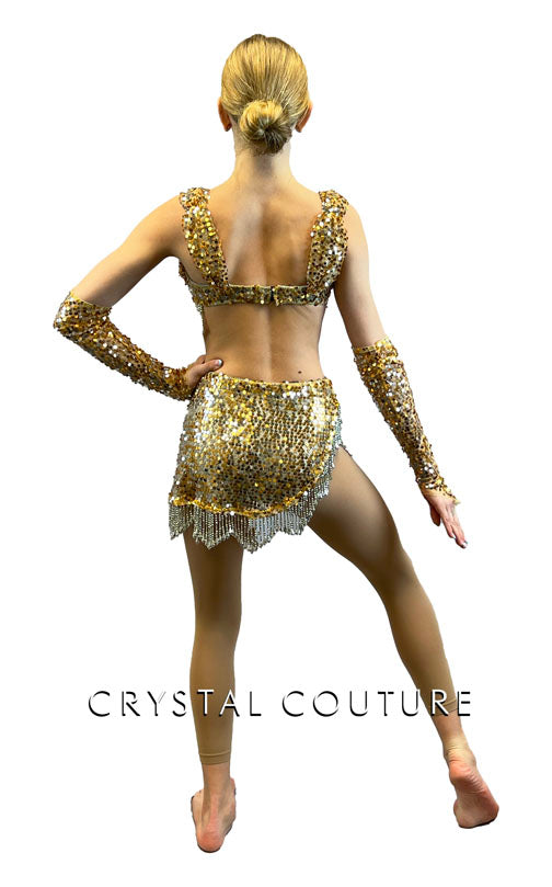 Custom Gold & Silver Connected Bra Top 2 Piece with Sequined and Beaded Fringe Skirt
