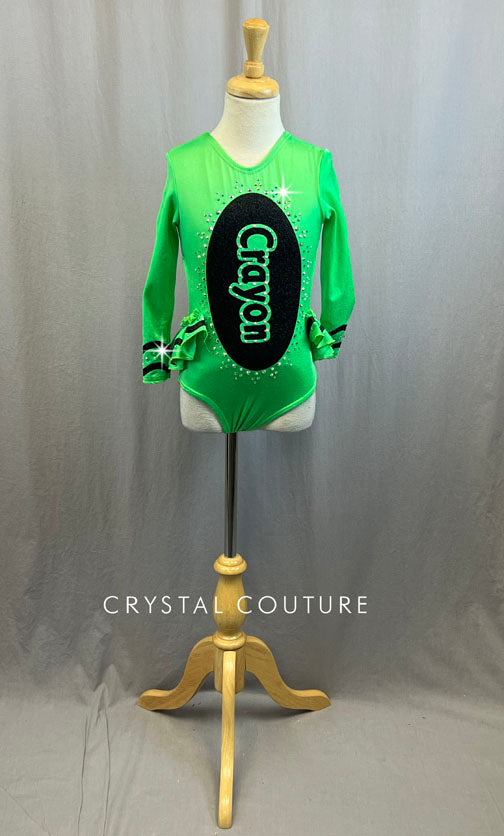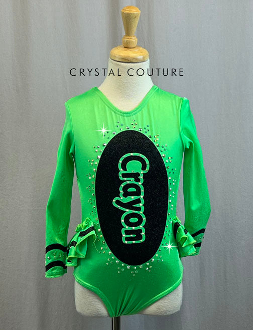 Adorable custom long sleeved Crayon leotard with front torso logo in Black sparkly vinyl. Traditional Black wavy crayon details along wrists and ruffles. Over a gross of Unfoiled Crystal AB rhinestones add that sparkle for the stage for this unique and fun design.