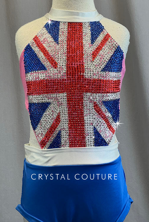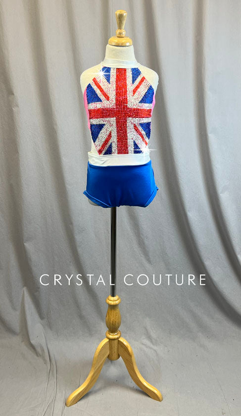 Custom High neck halter leotard has open back and side cutouts. Trunk of leotard are Royal blue and front of bodice has 8 gross of hot fixed rhinestones in a flag design of Great Britain.