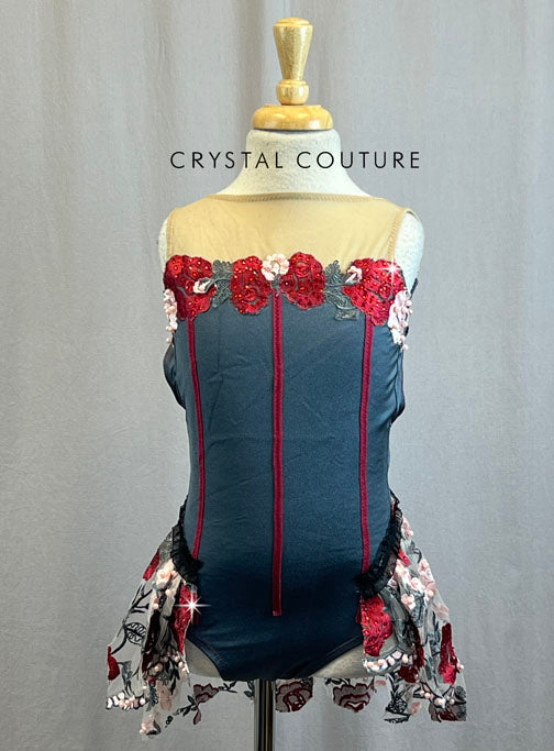 Custom Grey Leotard with Rose Embroidered Mesh and Pearl Details