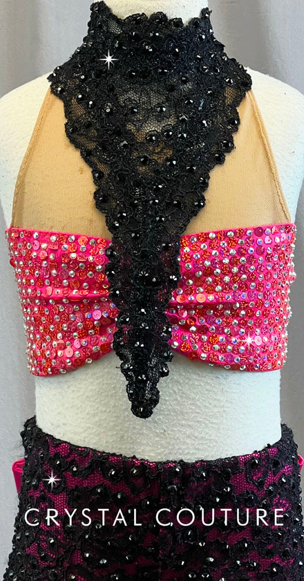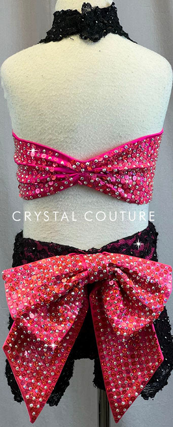 Custom Hot Pink Halter top with Light Pink Zodiac sequins and Crystal AB 16ss covering the entire bodice, and attached high neck Black Lace with Jet 30ss Rhinestones. Hot Pink lycra booty shorts lined with Black lace are covered in Jet 30ss and attached Hot Pink back bow with Light Pink Zodiac sequins and Crystal AB 16ss. WOW!! Over 12.5 gross of Crystal AB 20ss and Jet 30ss *Accessories include Hot Pink and Black Lace Fingerless Gloves