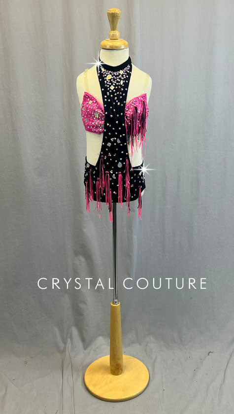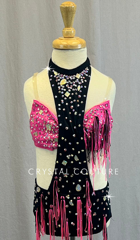 Custom Hot Pink bra top has clear straps and rhinestoned ring on back. Black panel down center of torso connects to trunks. Bundles of Hot Pink and Black fringe on trunks and left chest. Acrylic shapes throughout. 2 Gross of Crystal AB 20ss and 30ss, and Light Rose AB 20ss and 30ss Rhinestones