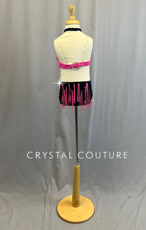 Custom Hot Pink and Black Connected Two Piece with Fringe Bundles - Rhinestones
