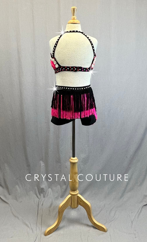 Custom Hot Pink pleated top has open back and is made from shimmer chiffon fabric. Black straps and edging with White sequin flowers around neckline. Black booty shorts with Hot Pink and Black layered fringe have asymmetrical hem. 1.3 Gross of Crystal AB 20ss and 30ss Rhinestones!