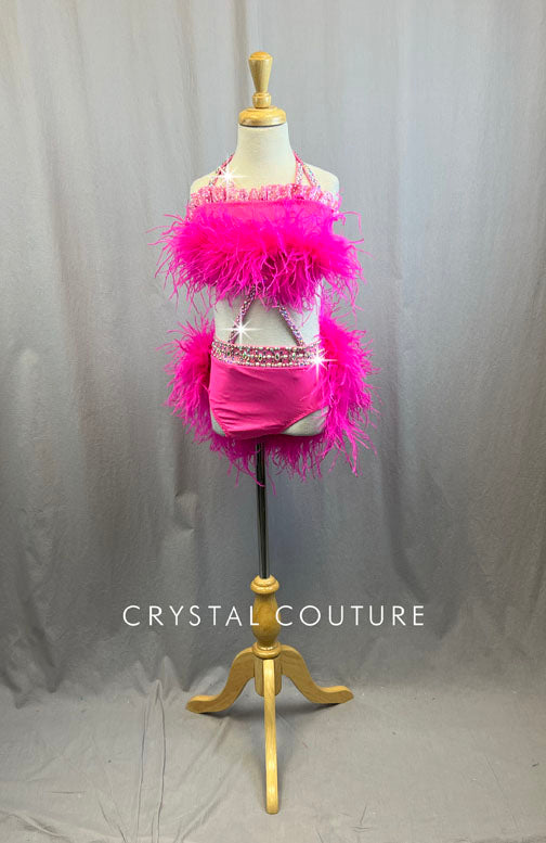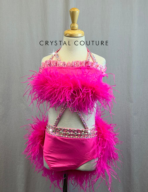 Custom Hot Pink Top and Brief Connected by Straps with Feathers - With Rhinestones