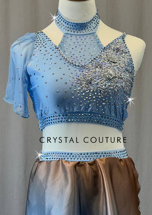 Custom Light Blue Asymmetrical Two Piece with Flutter Sleeve & Ombre Skirt - Rhinestones